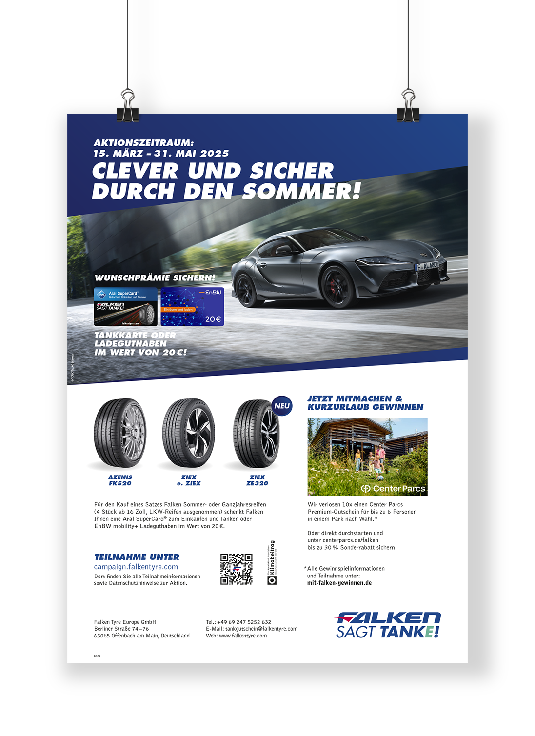 Kunden und Kundinnen, die sich zwischen dem 15. März bis 31. Mai 2025 für einen Satz Falken Sommer- oder Ganzjahresreifen (vier Stück ab 16 Zoll, LKW-Reifen ausgenommen) entscheiden, erhalten einen Tankgutschein. Zusätzlich haben Teilnehmer die Chance auf weitere attraktive Gewinne, darunter ein Kurzurlaub in einem Center Parcs ihrer Wahl für bis zu sechs Personen. Alle Infos und Teilnahme: www.mit-falken-gewinnen.de